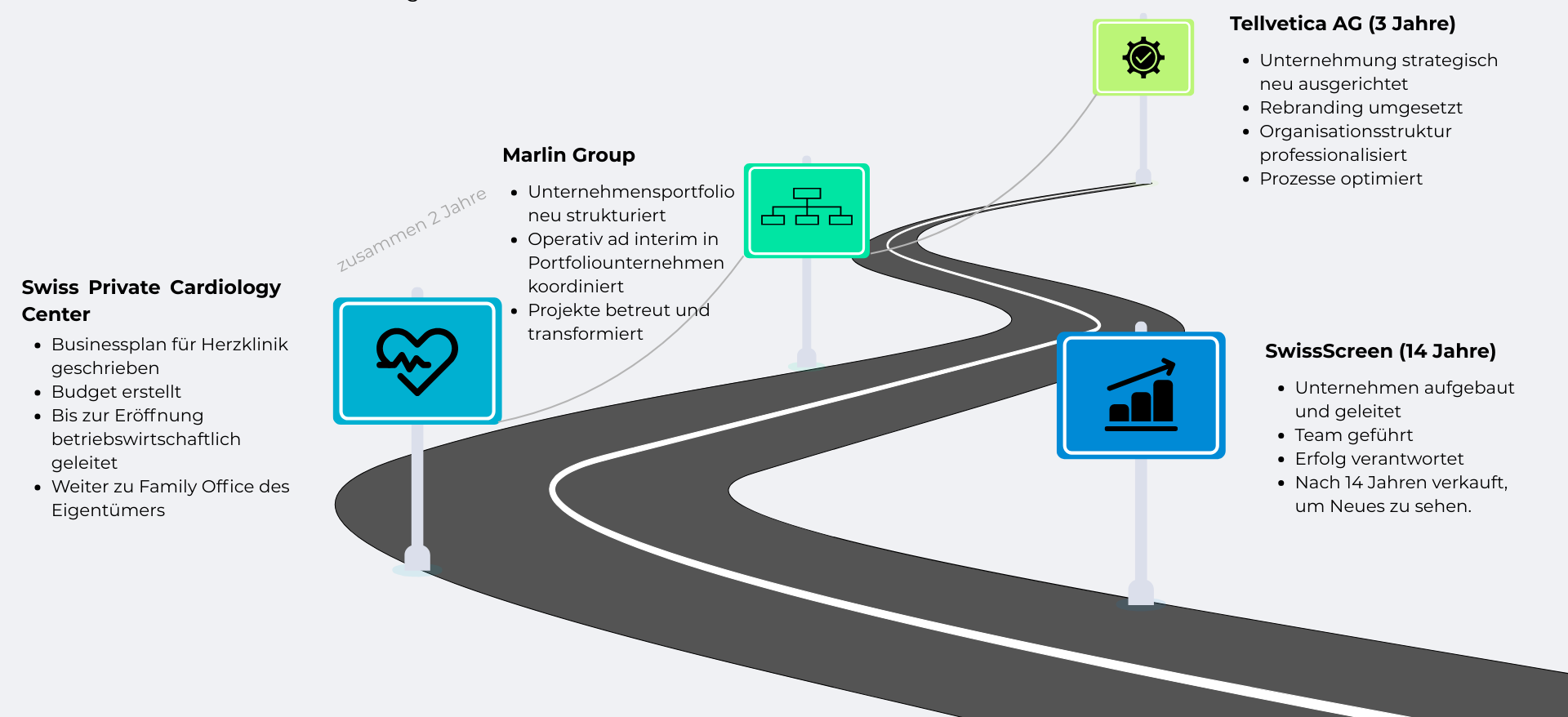 Während des Studiums an der Universität St. Gallen die erste Unternehmung gegründet, nach 14 Jahren verkauft. Danach wollte ich etwas anderes sehen - andere Herausforderungen, andere Ansichten. So folgten zunächst der Businessplan und (co-) Aufbau einer Herzklinik, von wo aus ich dann in das Family Office des Eigentümers wechselte. Danach ging es weiter im Bereich Finanzen und M&A. Nun möchte ich mein Know-How in einem Unternehmen einbringen, wo ich gemeinsam mit einem Team aktiv gestalten und etwas bewegen kann.